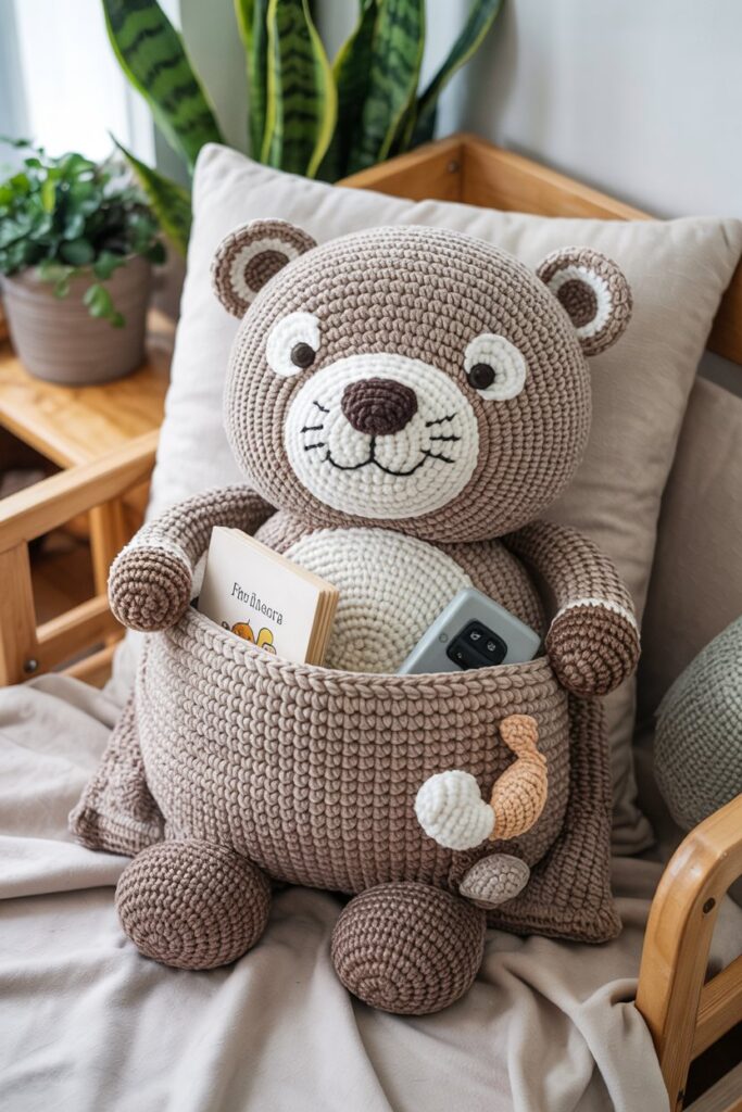 This handmade otter crochet project combines comfort and function in one. The design features a small pillow with a sewn-on pocket and a crochet otter detail stitched across the front. It’s perfect for holding books, remotes, or small toys in a child’s reading corner, car seat, or bedroom. Make it in soft yarns and washable fibers so it’s ready for everyday use. A great project for families, it brings together cozy style and smart storage.