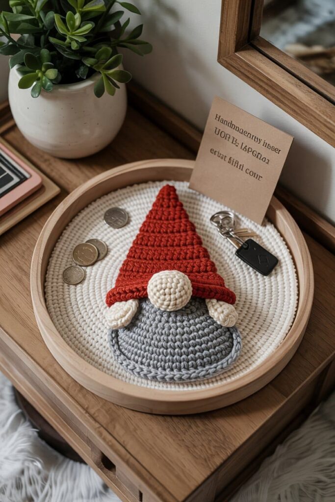Organize loose change or jewelry in a crochet gnome dish insert. This project creates a soft base layer for trays, with a stitched gnome in the center. Keeps items from sliding and adds a decorative pop to nightstands or entry tables. Combine with other items for a functional gift basket. You can also use it as a trinket tray liner or organizer insert in a drawer or desk.