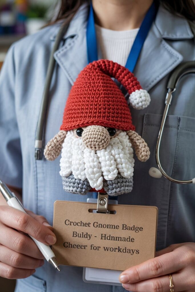 Upgrade your work badge with a crochet gnome clip cover. The small gnome fits over the reel or clip portion of an ID badge, bringing some cheer to your uniform. It’s workplace-friendly, non-obtrusive, and washable. A creative and personal gift for nurses, teachers, or anyone who wears a badge daily. Make sets for office holiday parties or use them to brighten up healthcare and service environments with personality.