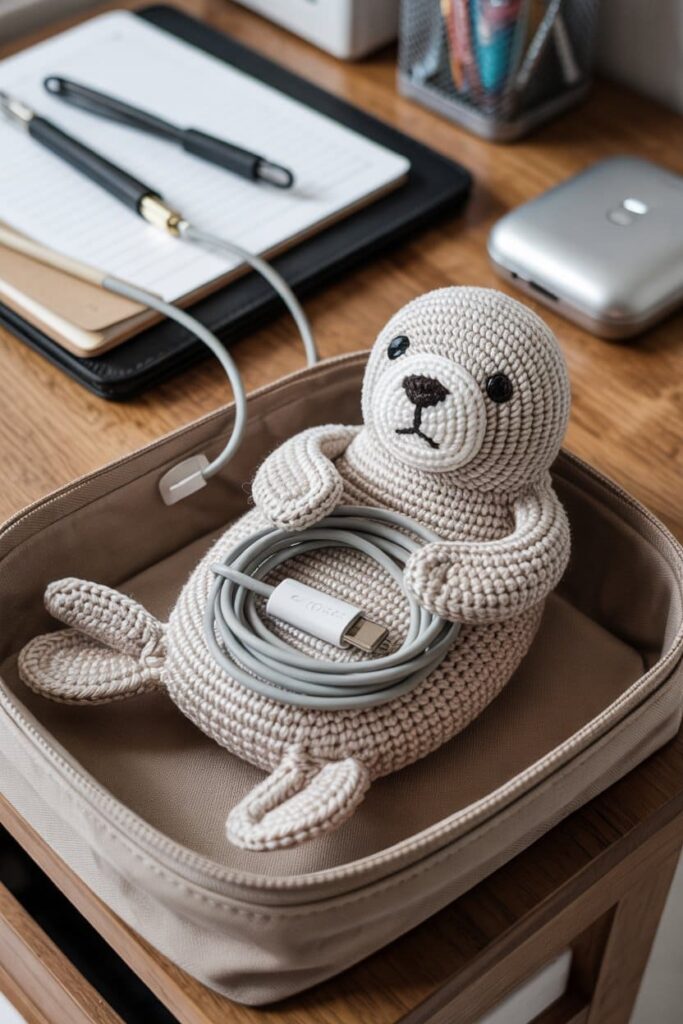 Tame messy cords with a crochet seal cord wrap organizer. This pattern creates a flat seal body with stitched-on flippers that wrap around your cables and fasten with a button or snap. Use it to organize phone chargers, earbuds, or appliance cords in drawers, backpacks, or on desks. The project uses very little yarn, making it a great stash buster and a thoughtful gift for students or remote workers. Simple, functional, and adorable—it’s a pattern you’ll want to make multiples of.